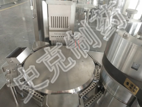 5、配備粉體物料充填機(jī)構(gòu),使粉體物料經(jīng)過(guò)膠囊填充料倉(cāng)裝置連續(xù)均勻強(qiáng)制下料至膠囊填充區(qū);
